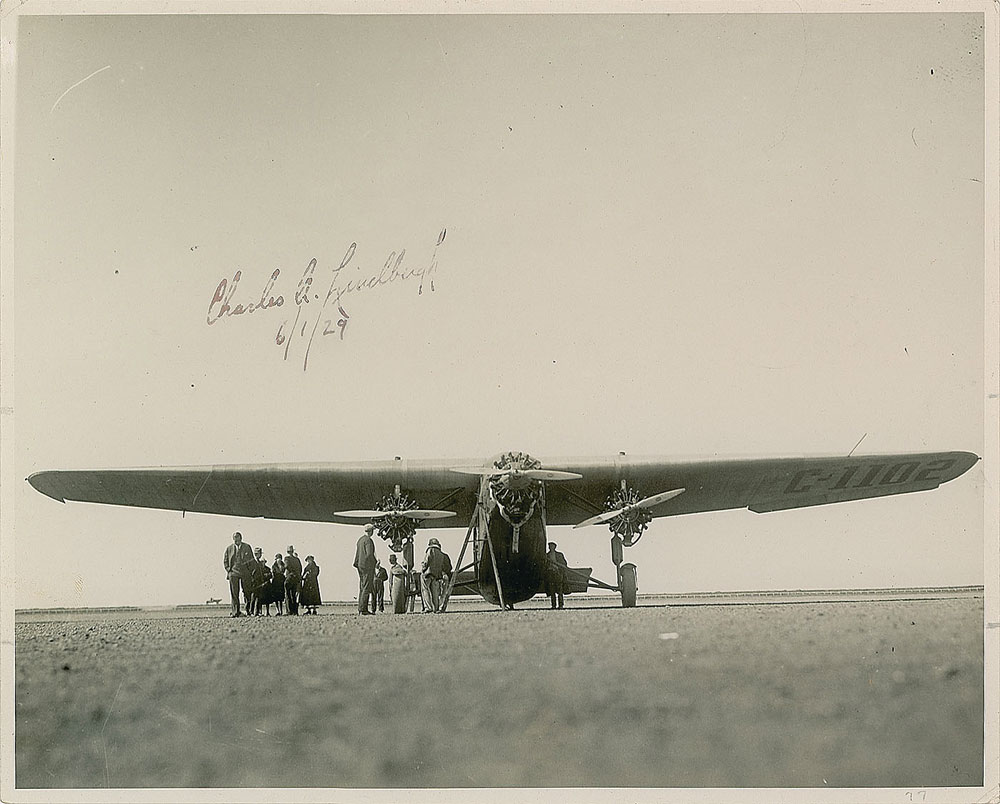 Vintage glossy 9.75 x 8 photo of an unusual tri-motor airplane in a field, signed in fountain pen, "Charles A. Lindbergh, 6/1/29." In very good to fine condition, with scattered light creasing, and some fading and irregular ink adhesion to the signature.