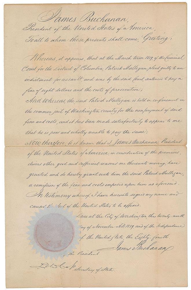 Manuscript DS as president, one page, 10.5 x 16.5, November 29, 1859. President Buchanan grants Patrick Mulligan, "held in confinement in the common jail of Washington county…and wholly unable to pay" a fine of eight dollars and the cost of prosecution, "a remission of the fine and costs imposed upon him" for a previous assault conviction. Crisply signed at the conclusion by Buchanan, and countersigned by Secretary of State Lewis Cass. White-and-red paper seal remains affixed to lower left. In very good to fine condition, with old repairs on the reverse to complete separation along the central horizontal fold.