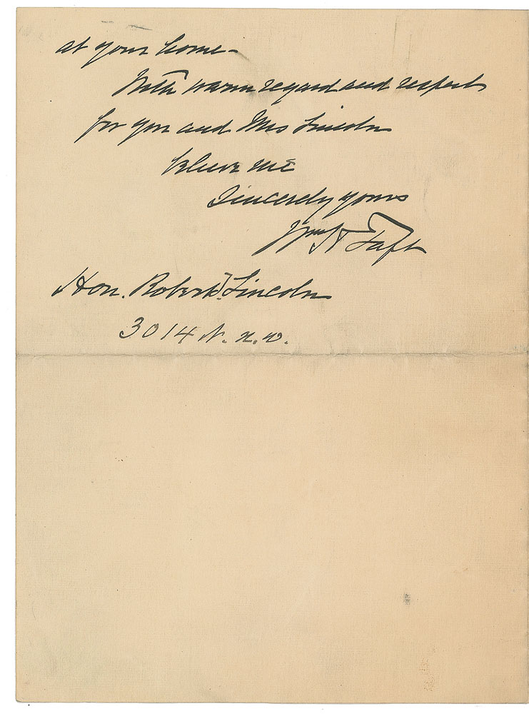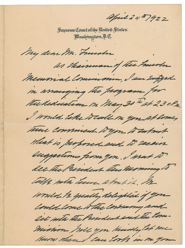 Boldly penned ALS as chief justice signed "Wm. H. Taft," two pages on two adjoining sheets, 5.75 x 7.75, Supreme Court of the United States letterhead, April 24, 1922. Letter to Robert Todd Lincoln, in part: "As chairman of the Lincoln Memorial Commission, I am engaged in arranging the program for the dedication on May 30th at 2.30 PM. I would like to call on you at some time convenient to you to submit what is proposed and to receive suggestion from you. I went to see the President this morning to talk with him about it. We would be greatly delighted if you could come to the ceremony and sit with the President and the Commission. Will you kindly let me know when I can look in on you at your home." In fine condition. Provenance: The Everett Fisher Collection.