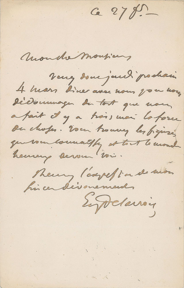 French artist (1798-1863) who takes a place in the first rank of painters in the Romantic tradition and whose mastery of color and technique inspired both the Impressionist and Symbolist schools. ALS in French, signed “Eug. Delacroix,” one page, 5.25 x 8, February 27, [no year]. Letter to a gentleman, inviting him to come to dinner to clear up some misunderstanding. In fine condition.