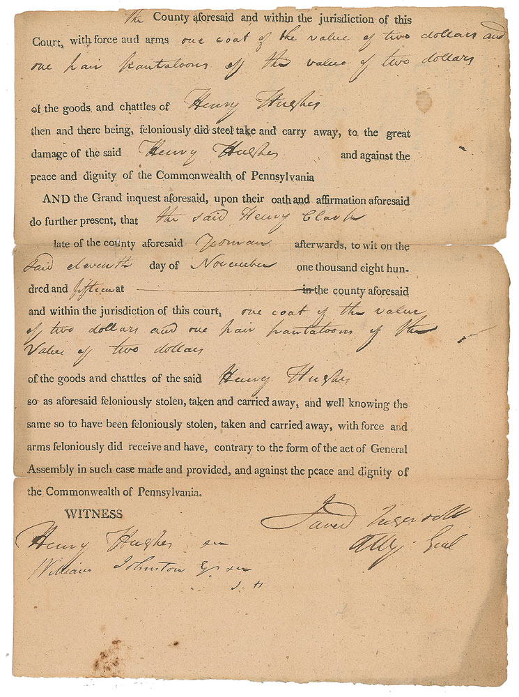 Signer of the US Constitution from Pennsylvania (1749-1822) who also ran unsuccessfully as the Federalist vice-presidential candidate in the 1812 election. Partly-printed DS, signed “Jared Ingersoll, Atty Genl,” one page, 6.75 x 9, November 11, 1815. Legal document concerning a theft case, in part: "The Grand Inquest aforesaid, upon their oath and affirmation aforesaid do further present, that the said Henry Clark late of the county aforesaid Yeoman afterwards, to wit on the said eleventh day of November one thousand eight hundred and fifteen at the county aforesaid and within the jurisdiction of this court, one coat of the value of two dollars and one pair pantaloons of the value of two dollars of the goods and chattles of the said Henry Hughes." In very good condition, with trimmed edges, and splitting along the fragile folds.