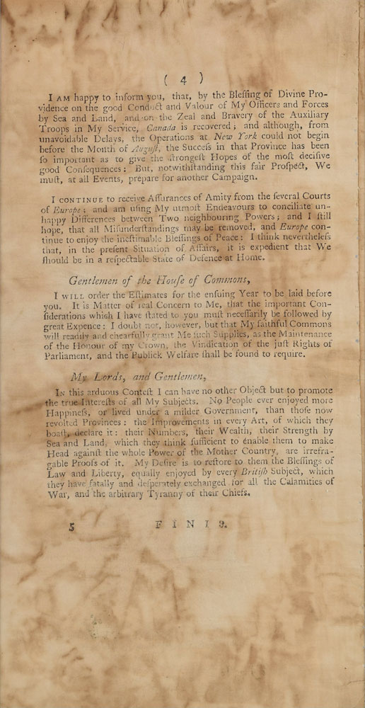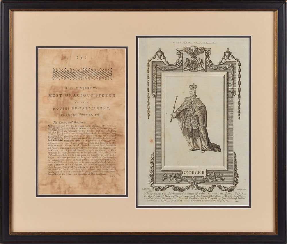 Very rare early printing of King George III's first response to the Declaration of Independence, "His Majesty’s Most Gracious Speech to Both Houses of Parliament, on Thursday, October 31, 1776," one page both sides, 6.5 x 11, printed in London by Charles Eyre and William Strahan, Printers to the King’s most Excellent Majesty, 1776. In part: "My Colonies in North America…have now openly renounced all Allegiance to the Crown, and all political Connection with this Country…My Desire is to restore to them the Blessings of Law and Liberty, equally enjoyed by every British Subject, which they have fatally and desperately exchanged for all the Calamities of War, and the arbitrary Tyranny of their Chiefs." Beautifully double-matted and framed with an engraved portrait of the king to an overall size of 21.25 x 18.25, with a glass backing for viewing the reverse. In very good condition, with moderate overall staining, and old tape along the left edge.