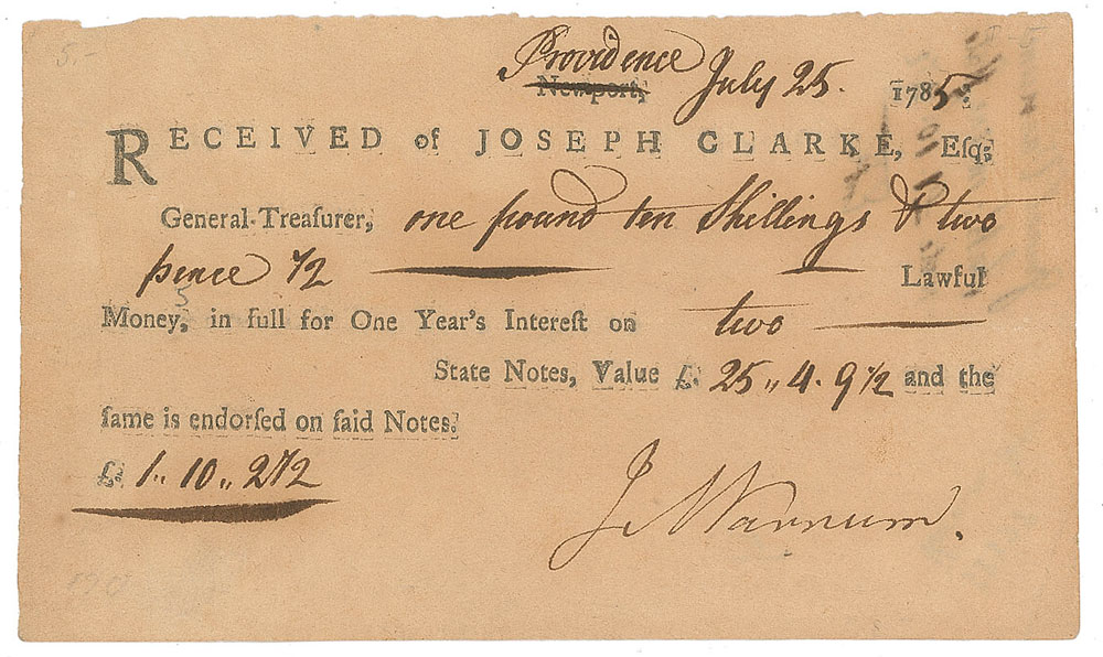 American legislator, lawyer, general (1748-1789) in the Continental Army during the American Revolutionary War; he was also a pioneer to the Ohio Country and a justice of the Supreme Court of the Northwest Territory. Very rare partly-printed DS, signed “J. M. Varnum,” one page, 6 x 3.5, July 25, 1785. In full: "Received of Joseph Clark, Esqr; General-Treasurer, one pound ten shillings & two pence 1/2—Lawful Money, in full for One Year's Interest on two State Notes, Value £25.4.9 1/2 and the fame is endorsed on said Notes." In fine condition.
