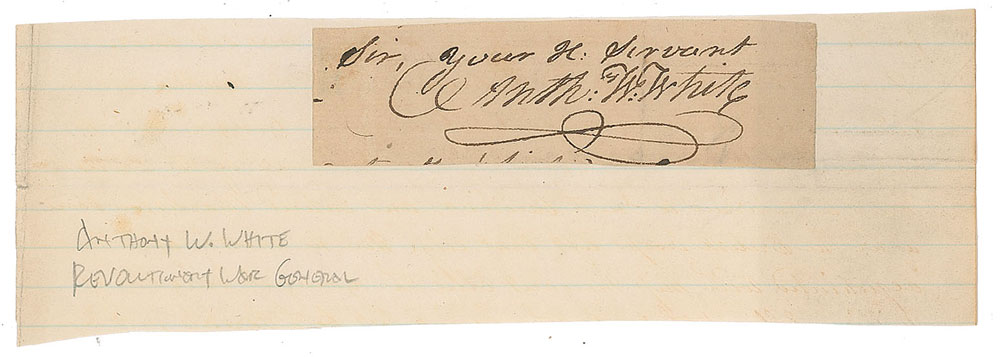 Brigadier General in the Continental Army (1750-1803) during the American Revolutionary War who had previously served as an aide-de-camp to General George Washington. Scarce ink signature, "Sir, Your H: Servant, Anth: W: White,” on an off-white 4.25 x 1.25 slip affixed to a slightly larger sheet. In fine condition. Accompanied by an engraving bearing a preprinted facsimile signature.