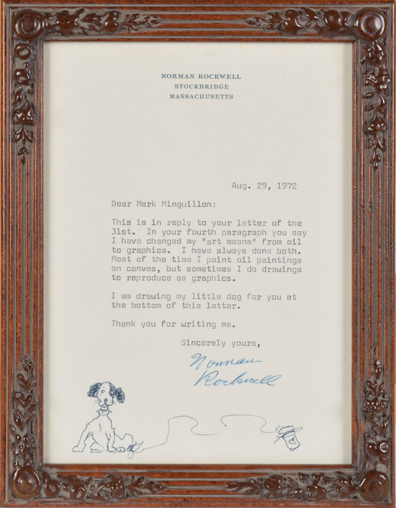 TLS, one page, 5.5 x 7.5, personal letterhead, August 29, 1972. Letter to Mark Minguillon, in full: "This is in reply to your letter of the 31st. In your fourth paragraph you say I have changed my 'art means' from oil to graphics. I have always done both. Most of the time I paint oil paintings on canvas, but sometimes I do drawings to reproduce as graphics. I am drawing my little dog for you at the bottom of this letter. Thank you for writing me." Rockwell adds a ballpoint sketch of a seated dog with an open tin can tied to its tail. Framed to a slightly larger size. In fine condition. A wonderfully brief missive boasting both ideal content and a sought-after original sketch from the great American artist.