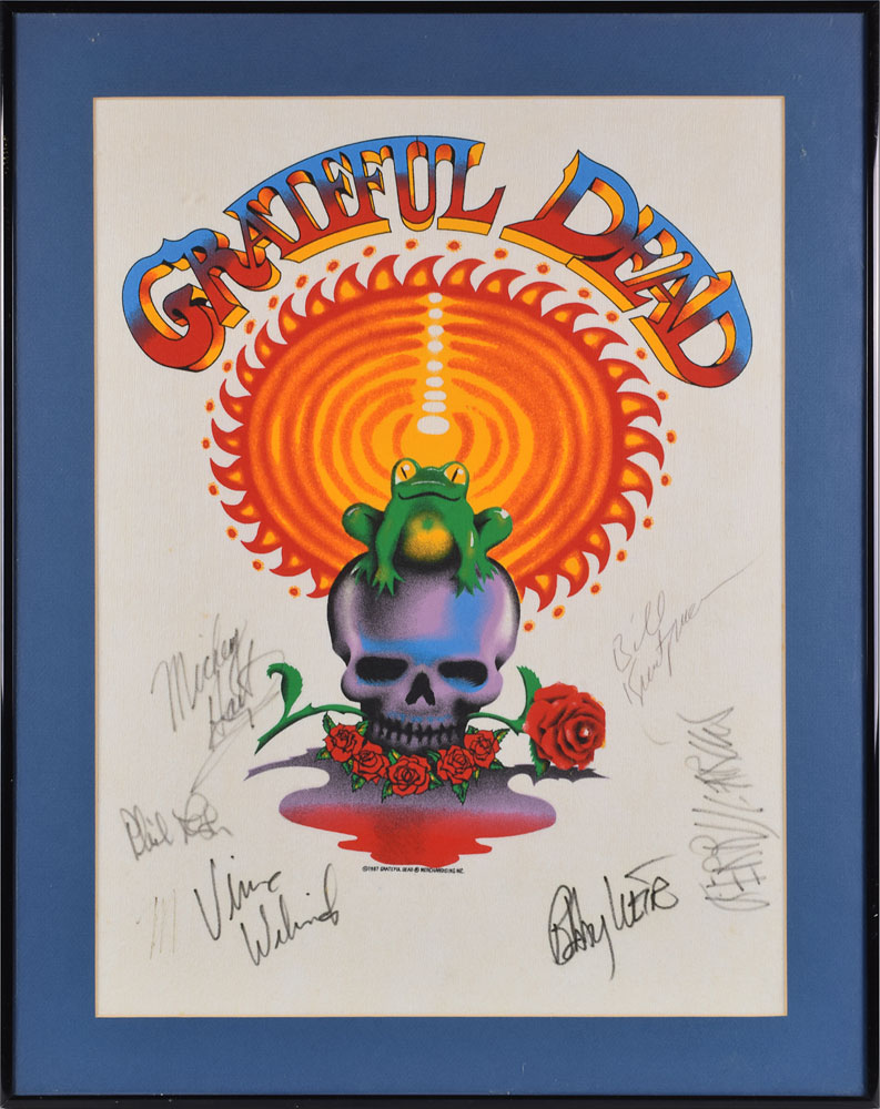 Wonderful color t-shirt artwork pelon showing a frog perched on a skull with several red roses against a rippling sun background, with large red-and-blue stylized text above, "Grateful Dead," 15.5 x 19.5, signed in black felt tip by Jerry Garcia, Mickey Hart, Phil Lesh, Bill Kreutzman, Bob Weir, and Vince Welnick. In fine condition, with a stray "M" in the lower left where Hart failed at his first attempt at signing. Accompanied by a full letter of authenticity from REAL. These pelons were printed in very low quantities making this a very scarce piece. This particular design was used for the band's appearance at the 1987 Mountain Aire Festival, which was held at the Calaveras County Fairgrounds in Angels Camp, California, on August 22-23, 1987.