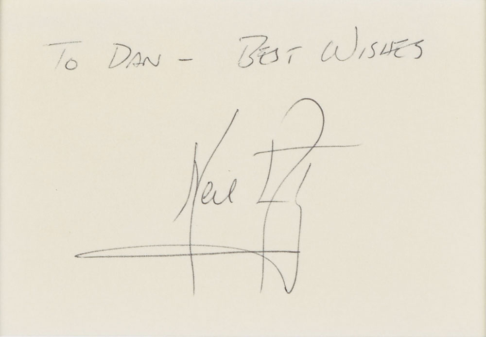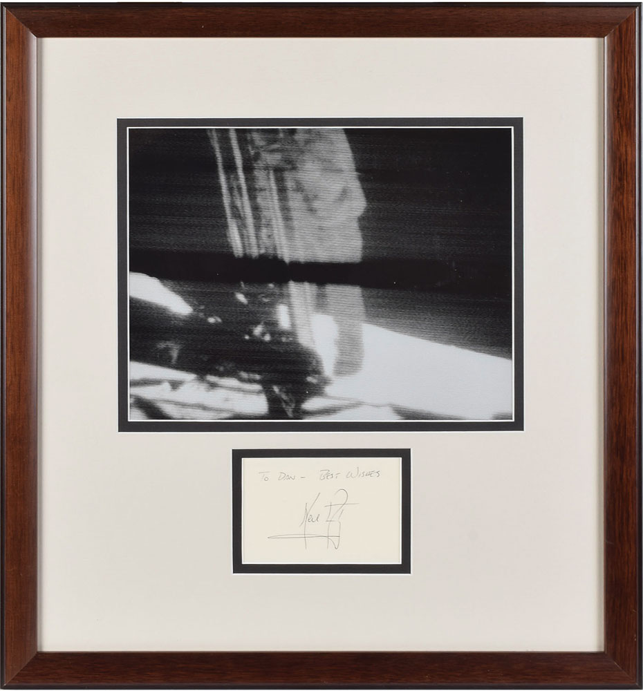 Ballpoint signature and inscription, “To Dan—Best wishes, Neil Armstrong,” on an off-white 4 x 2.75 card. Double-matted and framed with an image of Armstrong's televised first step on the moon to an overall size of 16.25 x 18. In fine condition.