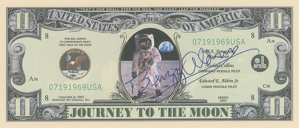 Two items offered directly by Buzz Aldrin: a souvenir "Journey to the Moon" 11-dollar bank note, 6 x 2.5, with front showing an image of Buzz Aldrin on the moon, and reverse featuring the Apollo 11 crew posing in their white space suits, signed on the front in blue ballpoint by Aldrin; and a color semi-glossy 4 x 5.75 full-length photo of Aldrin standing on the lunar surface, signed in blue felt tip, "Buzz Aldrin, Apollo XI." In overall very fine condition. Proceeds benefit Aldrin’s new Human SpaceFlight Institute, a premier think-tank and innovation center.