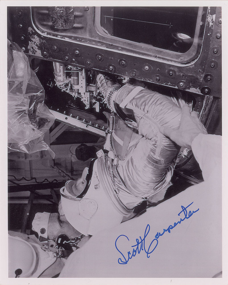 Satin-finish 10 x 8 photo of Scott Carpenter making his way into the Aurora 7 capsule, signed in blue felt tip by Carpenter. In fine condition.