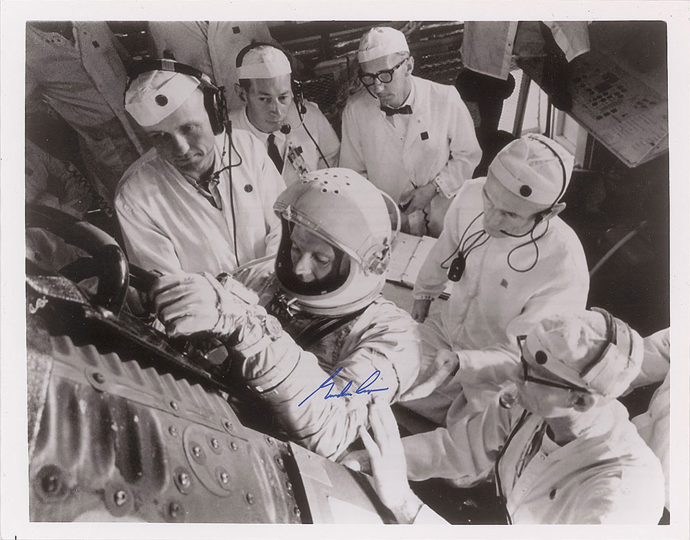 Glossy 10.25 x 8 photo of several NASA workers helping Gordon Cooper into his Faith 7 capsule, signed in thin blue felt tip by Cooper. In fine condition.