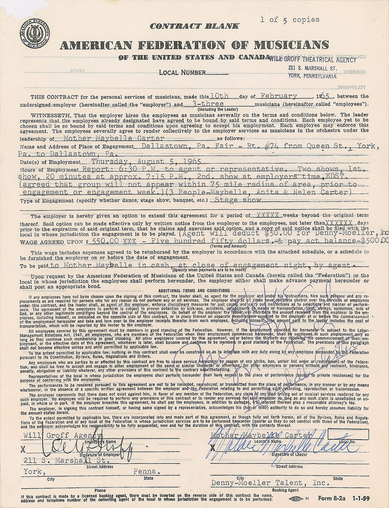American country musician (1909-1978) who is best known as a member of the historic Carter Family act in the 1920s and 1930s and also as a member of Mother Maybelle and the Carter Sisters; the mother of June Carter Cash. DS, one page, 8.5 x 11, February 10, 1965. American Federation of Musicians contract in which Mother Maybelle Carter agrees to play two shows at the Dallastown, Pennsylvania Fair on August 5, 1965, for a sum of $550. Signed at the conclusion in blue ballpoint by Carter, with another hand adding notations above. In fine condition, with paper loss to the upper left corner.