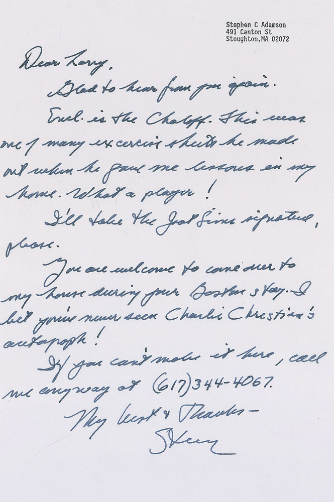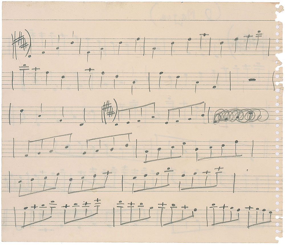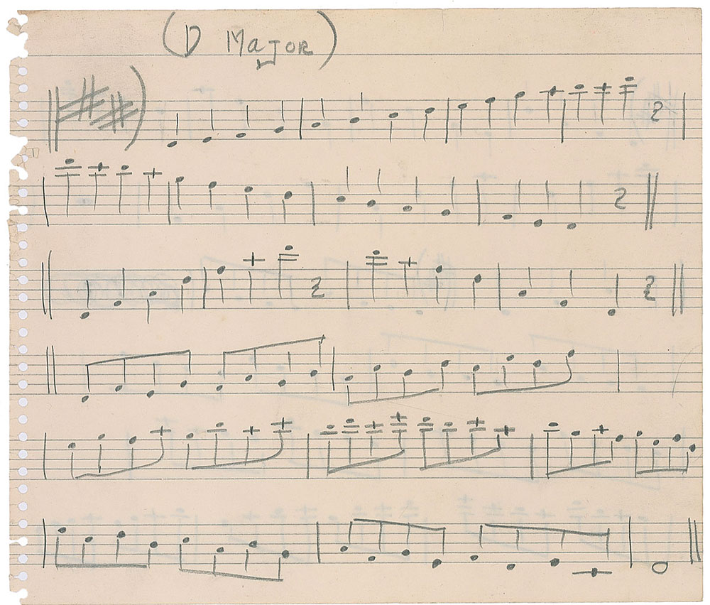 American jazz baritone saxophonist (1923-1957) who played with Boyd Raeburn's short-lived big band, Georgie Auld, Jimmy Dorsey, and Count Basie; he first became well known as one of the 'Four Brothers' reed section in Woody Herman's Second Herd. Unsigned handwritten musical exercise, in pencil, on an 8 x 6.75 musically-lined sheet, one page, both sides, marked in the upper border by Chaloff “(D Major).” Chaloff writes a total of 37 bars of music which he used as part of a lesson for a music student. Includes a letter from the original owner stating, “This was one of many exercise sheets he made out when he gave me lessons in my home.” In fine condition.
