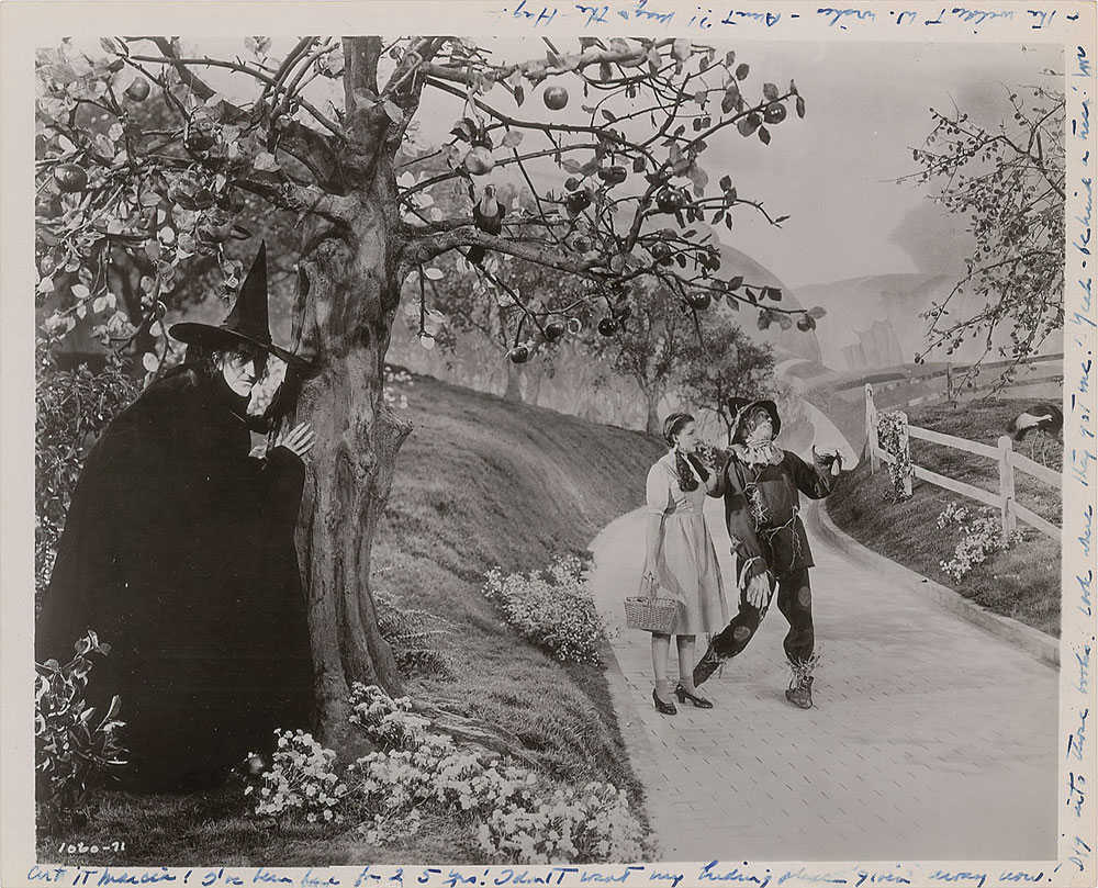 Glossy 10 x 8 photo of the Wicked Witch of the West spying on Dorothy and the Scarecrow as they walk down the yellow brick road, playfully signed and inscribed around the borders in fountain pen, "Cut it Marcia! I've been here for 25 years! I don't want my hiding place given away now! Dig into those books! Look where they got me! Yeah—behind a tree! Love—the wildest W. wishes—Aunt?! Mag the Hag!.” In very good to fine condition, with a short tear to the right edge, and some light brushing to the ink.