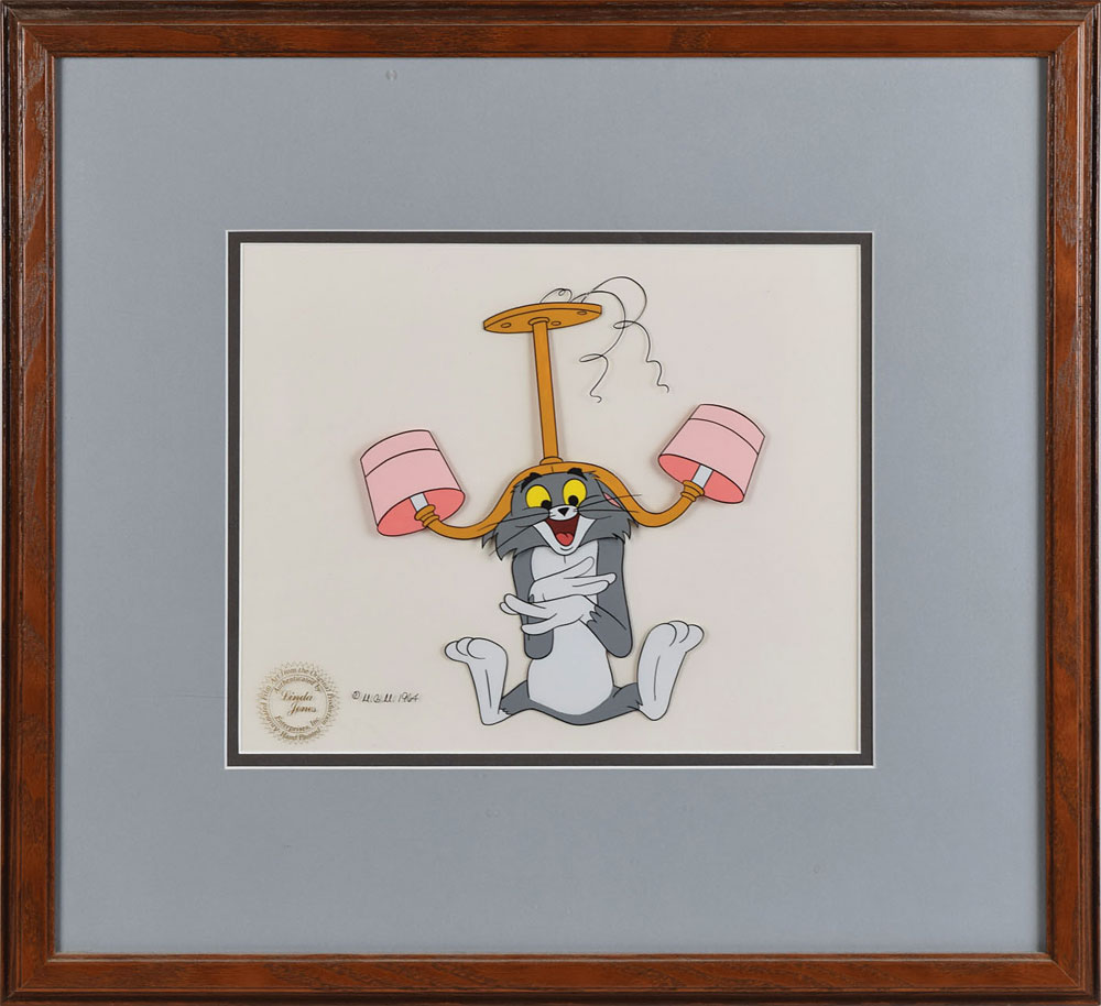 (MGM Studios, 1964) Original production cel featuring Tom from the Tom and Jerry episode 'The Year Of The Mouse,' showing the beloved mouse-chasing tomcat with a pink chandelier on his head. Image measures 7 x 8, with a mat opening of 11 x 9. Framed to an overall size of 19.75 x 17.75. The cel has a gold Linda Jones Enterprises seal to the lower left, as well as a "M.G.M. 1964" copyright notation. In fine condition. Learn more about our Animation Expert, Harry Kleiman.