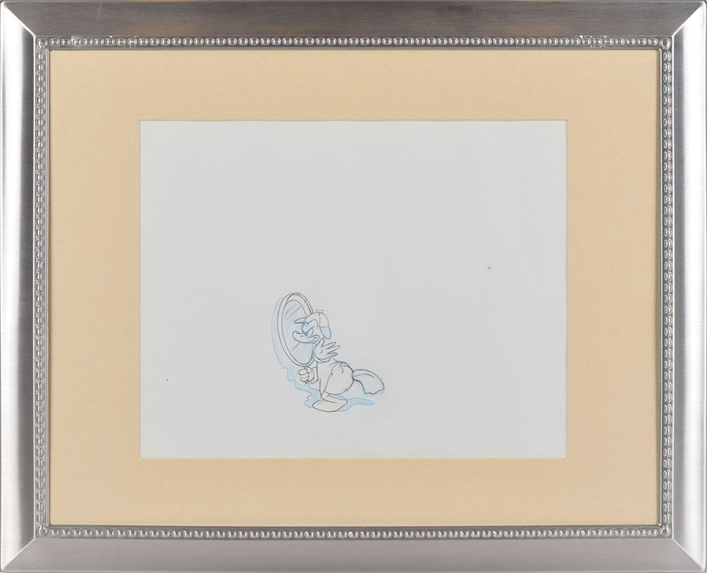 (Walt Disney Studios) Original production cel and matching production drawing featuring Donald Duck as Sherlock Holmes looking through an oversized magnifying glass. The cel is set against a pre-printed color background of a castle full of gold. Character image measures 2.5 x 2.75, with a mat opening of 9.5 x 7.5. Individually framed to 15.75 x 12.75. In overall fine condition. Learn more about our Animation Expert, Harry Kleiman.