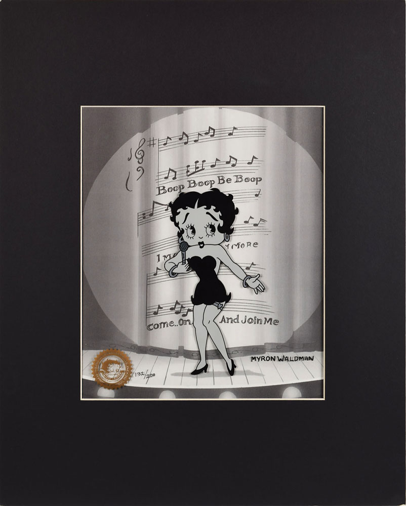 Limited edition hand-painted animation cel entitled 'Betty on Stage,' numbered 132/200, 9.5 x 11.5, signed in black ink by noted Fleischer Studios animator Myron Waldman. Set against a pre-printed musical background and matted to an overall size of 16 x 20. Cel bears a 1999 King Features seal to lower right. In fine condition. Learn more about our Animation Expert, Harry Kleiman.