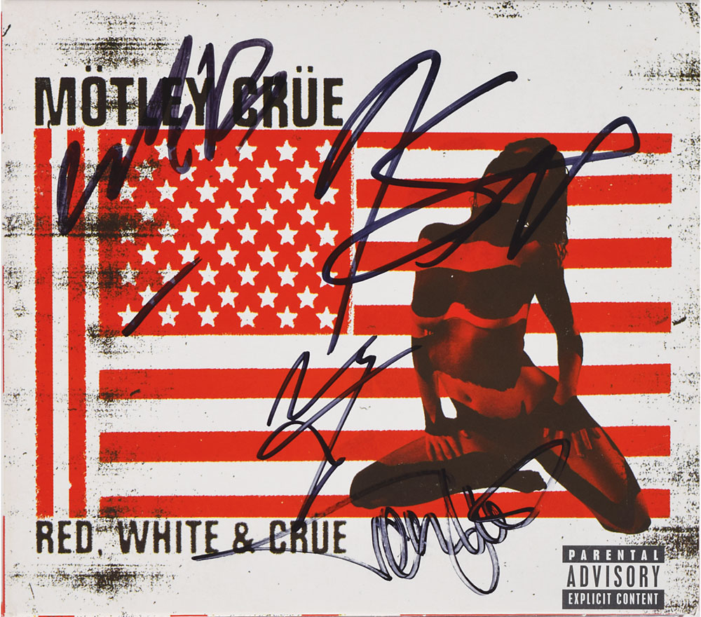 Red, White & Crüe CD signed on the front cover in black felt tip by Nikki Sixx, Mick Mars, Vince Neil, and Tommy Lee, and on the front of the booklet by John Corabi. In fine condition. The CDs are included.