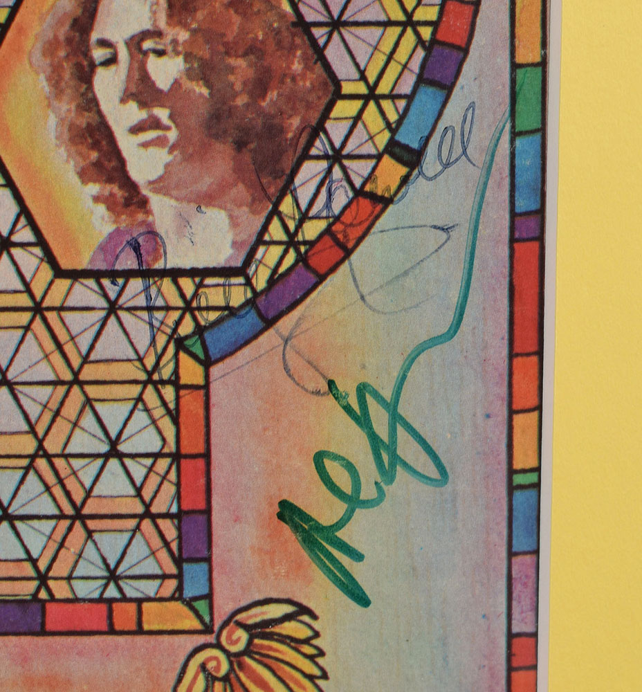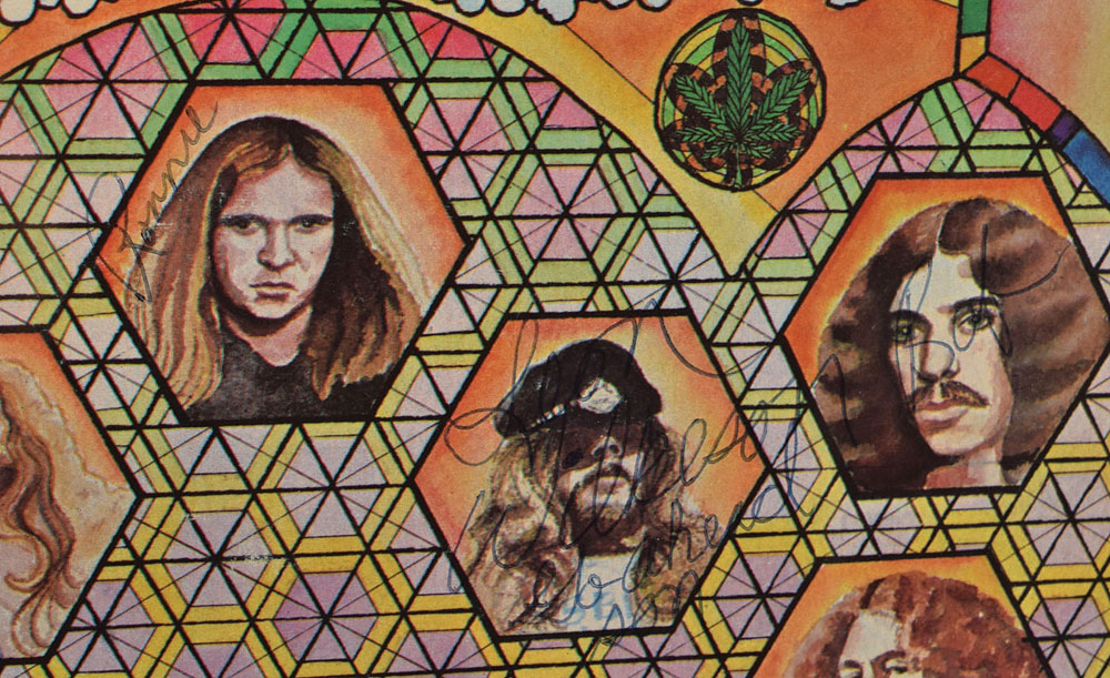 Second Helping album signed on the front cover in blue ballpoint, “Ronnie,” “Gary Rossington,” “Billy Powell,” and “Leon Wilkeson, Go ahead son”; in green felt tip, “Al Kooper”; signed on the back cover in blue ballpoint, “Allen Collins”; and signed later on the front cover in black felt tip, “J. J. Cale 1988” Matted and framed with a small plaque to an overall size of 28 x 15.5. The album is split and unfolded, matted, and framed to an overall size of 28.25 x 16. In fine condition, with a clipped corner and moderate contrast to several of the signatures. The record is not included. This was the band’s sophomore album which they released in 1974 and contained their breakthrough hit ‘Sweet Home Alabama,’ and would eventually go multi-platinum. Such early band-signed albums are incredibly scarce.