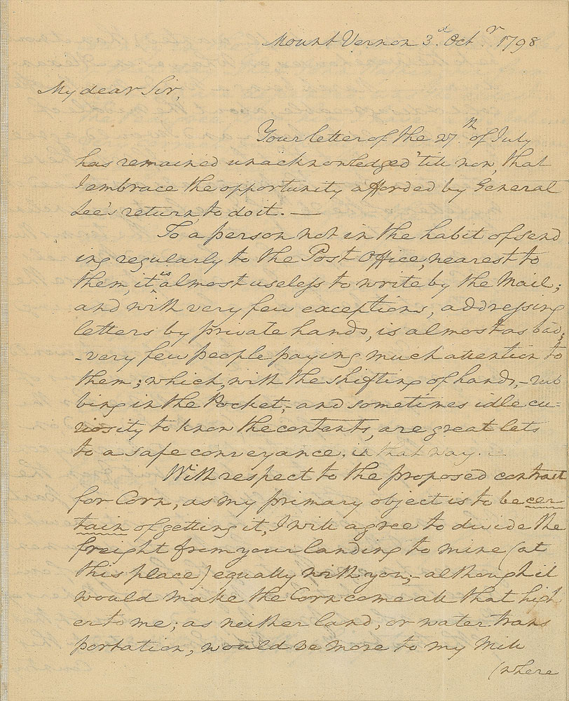 With respect to the proposed contract for corn, as my primary object is to be certain of getting it, I will agree to divide the freight from your landing to mine (at this place) equally with you; although it would make the corn come all the higher to me; as neither land, or water transportation, would be more to my mill (where it will be chiefly wanted) than it would be to the warehouses, or Wharves in Alexandria. March being a windy month, often cold & disagreeable; about the middle of April would be better, and I would agree to receive it at that time. If with these alterations, from the proposals contained in my letter of the 26th of June last, you incline to enter into a contract upon the terms therein mentioned, for five hundred Barrels of corn, annually, I am ready to close the contract, to be binding for, and during our lives.