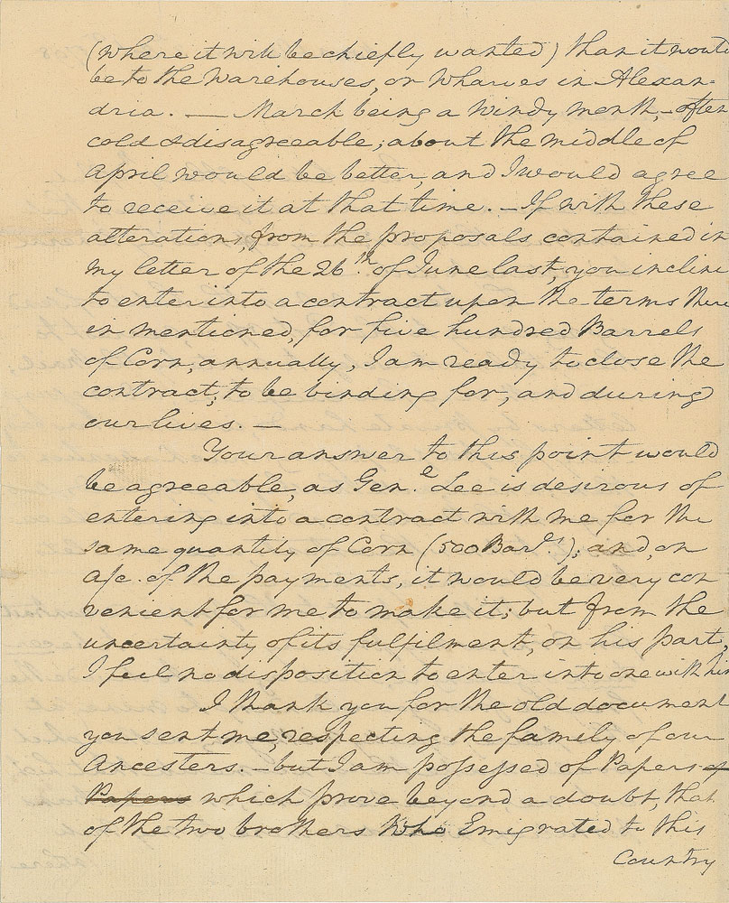 Your answer to this point would be agreeable, as Gen’l. Lee is desirous of entering into a contract with me for the same quantity of corn (500 Bar’ls); and on a/c of the payments, it would be very convenient for me to make it; but from the uncertainty of its fulfillment, on his part, I feel no disposition to enter into one with him.