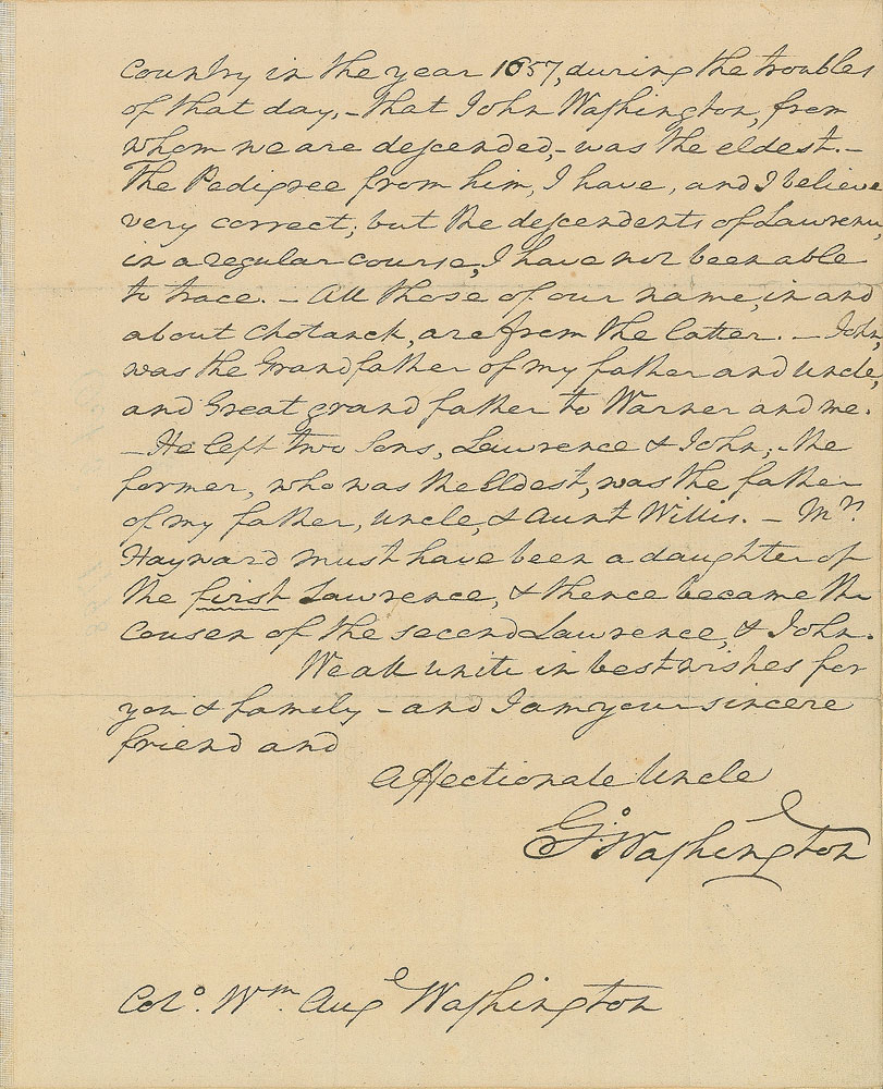 I thank you for the old documents you sent me, respecting the family of our ancestors, but I am possessed of Papers which prove beyond a doubt, that of the two brothers who emigrated to this Country in the year 1657, during the troubles of that day, that John Washington, from whom we are descended, was the eldest. The Pedigree from him, I have, and I believe very correct; but the descendants of Lawrence, in a regular course, I have not been able to trace. All those of our name, in and about Chotanck, are from the latter. John, was the Grandfather of my father and Uncle, and Great grand father to Warner and me. He left two sons, Lawrence & John; the former, who was the eldest, was the father of my father, uncle, and Aunt Willis. Mrs. Hayward must have been a daughter of the first Lawrence, & thence became the cousin of the second Lawrence, & John. We all unite in best wishes for you & family, and I am your sincere friend and Affectionate Uncle.” Professionally inlaid into a slightly larger sheet. In fine condition.