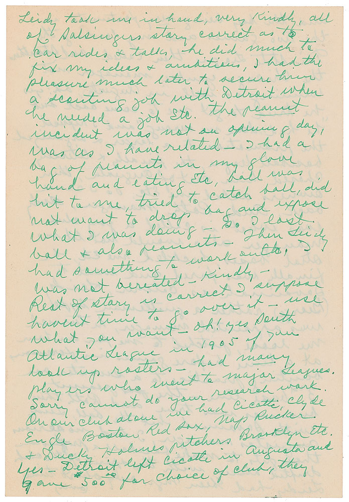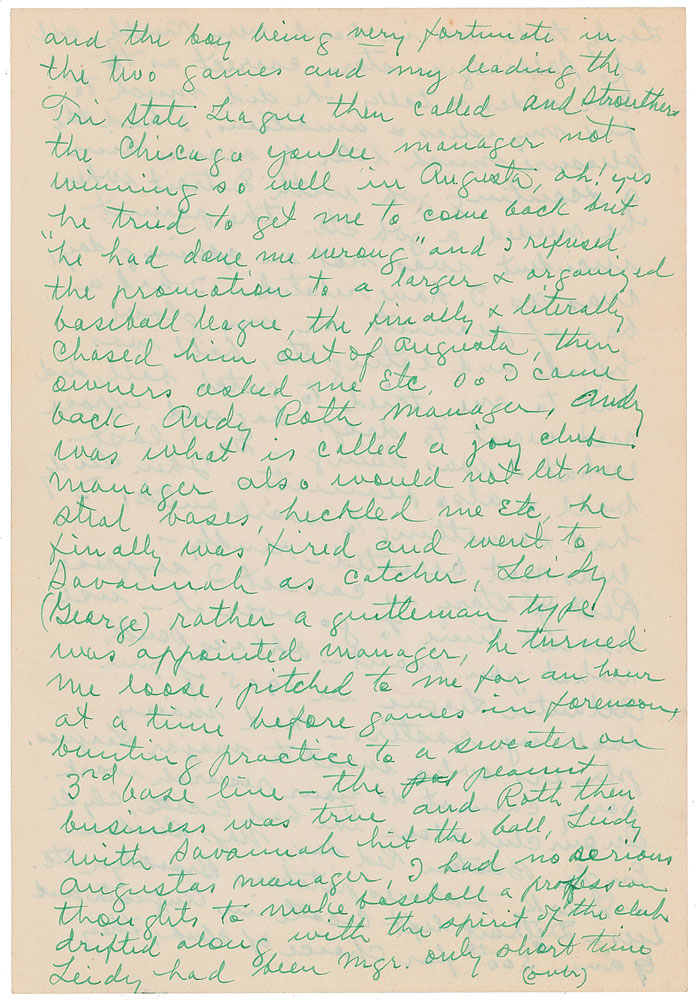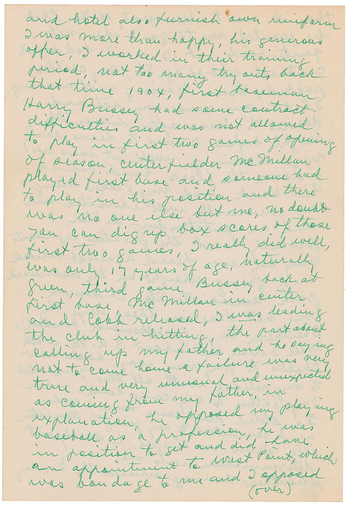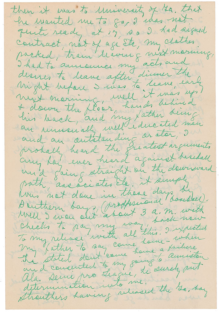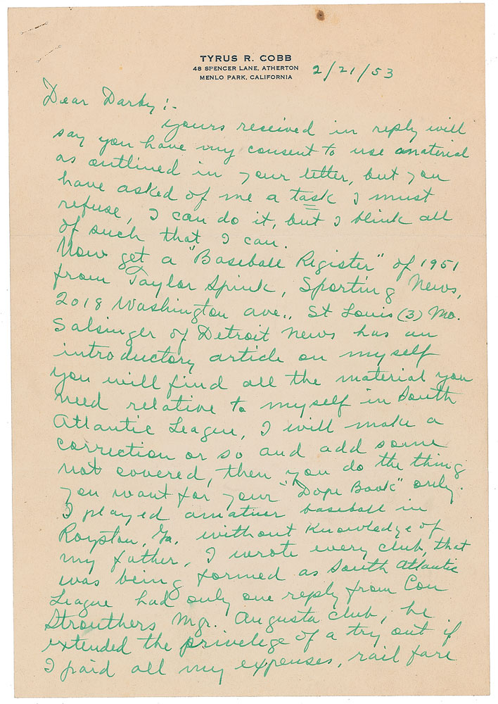 The earlier letter, seven pages, dated February 21, 1953, addressed to Cecil A. Darby, sports editor of the Columbus Ledger-Enquirer, detailing his early baseball career for use in Darby’s South Atlantic League Dope Book. The letter reads, in part: “I played amateur baseball in Royston, Ga. Without knowledge of my father, I wrote every club that was being formed as South Atlantic League had only one reply from Con Strouthers Mgr. Augusta Club, he extended the privilege of a try out if I paid all my expenses, rail fare and hotel also furnish own uniform. I was more than happy, his generous offer, I worked in their training period, not too many tryouts back that time 1904, first baseman Harry Bussey had some contract difficulties and was not allowed to play in first two games of opening of season, center fielder McMillan played first base and someone had to play in his position and there was no one else but me, no doubt you can dig up box scores of those first two games, I really did well, was only 17 years of age, naturally green, third game Bussey back at first base, McMillan in center and Cobb released, I was leading the club in hitting, the part about calling up my father and he saying not to come home a failure was very true and very unusual and unexpected as coming from my father, in explanation, he opposed my playing baseball as a profession, he was in position to get and did have an appointment to West Point, which was bondage to me and I opposed then it was to University of Ga. That he wanted me to go, I was not quite ready at 17, so I had signed contract, not of age, etc., my clothes packed, train leaving next morning, I had to announce my acts and desires to leave after dinner the night before I was to leave, early next morning, well it was up & down the floor; hands behind his back, and my father being an unusually well educated man and an outstanding orator, I probably heard the greatest arguments any boy ever heard against baseball and going straight on the downward path, associates, etc. it simply was not done in those days by southern boys, (professional baseball).” Cobb writes about going to Amiston, Alabama to join the semi-pro league, and details the “peanut” incident, when he dropped a ball hit to him as he unsuccessfully tried to mask the fact that he was eating from a bag of peanuts hidden in his glove. Cobb continues about his eventual career in baseball, indicating “I had no serious thoughts to make baseball a profession drifted along with the spirit of the club.” Cobb also adds a postscript signed “Ty.”