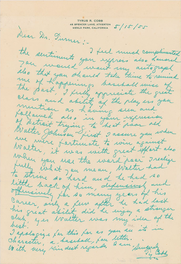The second ALS, one page, dated May 15, 1955, addressed to Dr. Turner, in full: “I feel much complimented the sentiments you express also honored you would want my autograph also that you should take time to remind me of happenings baseball wise of the past. I fully appreciate the great class and ability of the players you mention as having seen and followed also in your expression of Detroit trying to beat ‘poor old Walter Johnson,’ first I assure you when we were fortunate to win against Walter, it was with great effort also when you use the word ‘poor’ I realize fully what you mean, Walter had to strive so hard and he had so little back of him, defensively and offensively for so many years of his career, only a few after he had lost his great ability did he enjoy a stronger club, yes Walter was my idea of the best! I apologize for this as you see its in character; a baseball, fan letter.” In overall fine condition. Cobb purportedly stated that his greatest embarrassment on the diamond was when he batted against Johnson on a dark day in Washington—records show that Cobb batted .335 in 67 games against the Senators right-hander.
