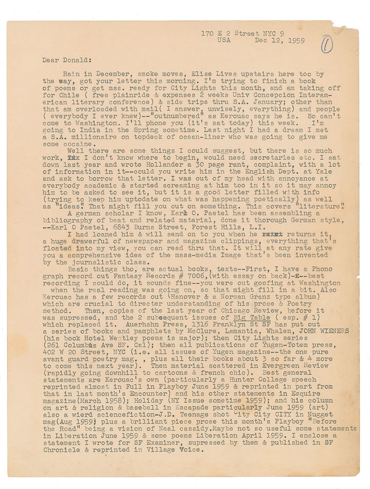 Lengthy and remarkable TLS signed “AG,” six pages on five sheets, 8.5 x 11, December 12, 1959. Letter to Donald Cook, research psychologist at the National Institute of Mental Health. Ginsberg discusses his work, censorship, drugs, sex legislation, writing, mass media, education, Zen, publishing, and more. In small part: "I'm trying to finish a book of poems or get mss. ready for City Lights this month, and am taking off for Chile…other than that am overloaded with mail (I answer, unwisely, everything) and people (everybody I ever knew)—'outnumbered' as Kerouac says he is. So can't come to Washington…A german scholar I know, Karl O. Paetel has been assembling a bibliography of beat and related material."