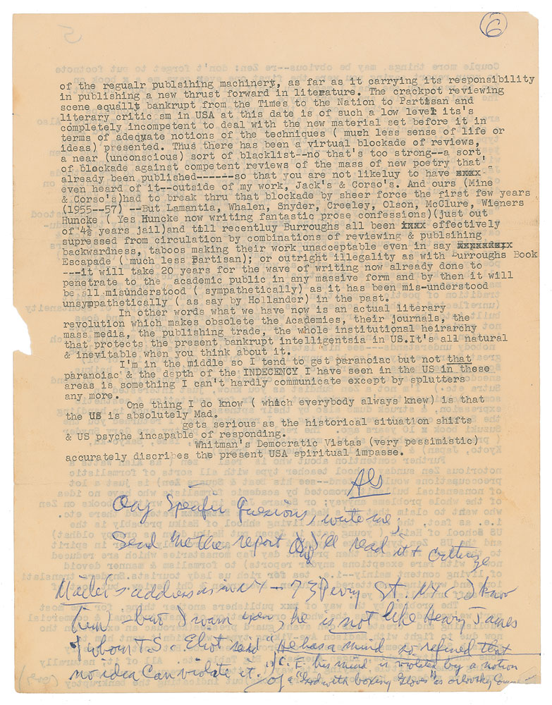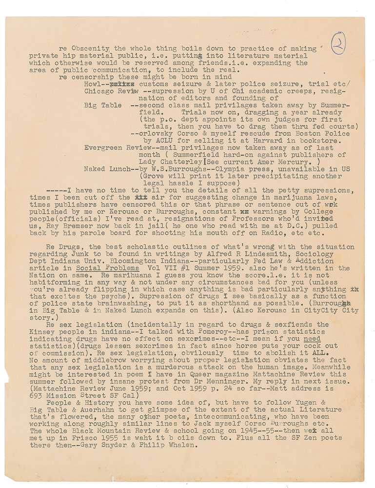 Ginsberg provides a lengthy list of said material, then continues: "re Obscenity the whole thing boils down to practice of making private hip material public, i.e. putting into literature material which otherwise would be reserved among friends. i.e expanding the area of public communication, to include the real. re censorship these might be born in mind: Howl—customs seizure & later police seizure, trial etc., Chicago Review—supression by U of Chi academic creeps, resignation of editors and founding of, Big Table—second class mail privileges taken away by Summerfield. Trials now on…orlovsky Corso & myself rescude from Boston Police by ACLU for selling it at Harvard in bookstore., Evergreen Review—mail privileges now taken away as of last month…Naked Lunch—by W.S.Burroughs—Olympia press, unavailable in US (Grove will print it later precipitating another legal hassle I suppose)—I have no time to tell you the details of all the petty supressions, times I have been cut off the air for suggesting change in marijuana laws, times publishers have censored this or that phrase or sentence out of work published by me or Kerouac or Burroughs, constant warnings…