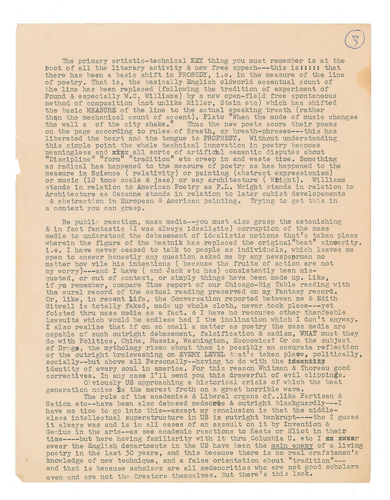 The primary artistic-technical key thing you must remember is at the root of all the literary activity & new free speech—this is: that there has been a basic shift in prosody, i.e. in the measure of the line of poetry. That is, the basically English oldworld accentual count of the line has been replaced (following the tradition of experiment of Pound & especially W.C. Williams) by a new open-field free spontaneous method of composition (not unlike Miller, Stein etc) which has shifted the basic measure of the line to the actual speaking breath (rather than the mechanical accent. Plato 'When the mode of music changes the walls of the city shake.' Thus the new poets score their poems on the page according to rule of Breath, or breath-phrases…Something as radical has happened to the measure of poetry as has happened to the measure in Science (relativity) or painting (abstract expressionism) or music (12 tone scale & jass) or say architecture (Wright). Williams stands in relation to American Poetry as F.L. Wright stands in relation to Architecture as Cezanne stands in relation to later cubist developements & abstraction in European & American painting…