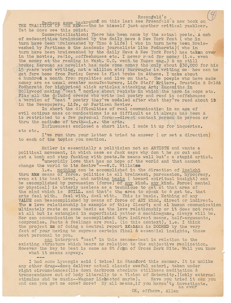 I had some Lysergic acid (twice) in Stanford this summer. It is unlike any other drug—does deliver classic aweful satori, taken under right circumstances (lie down darkroom absolute stillness meditation & transcendance out of body literally to a Vision of Eternity.) (only external stimulus shd be music—Wagner Liebestod maybe). Have you tried it can you and can you get me some? more?" Here, on the reverse of the fourth sheet, Ginsberg writes, "I.E. Tell Fleming & Ike that the Beat Creeps are the only mentally healthy pipple around."