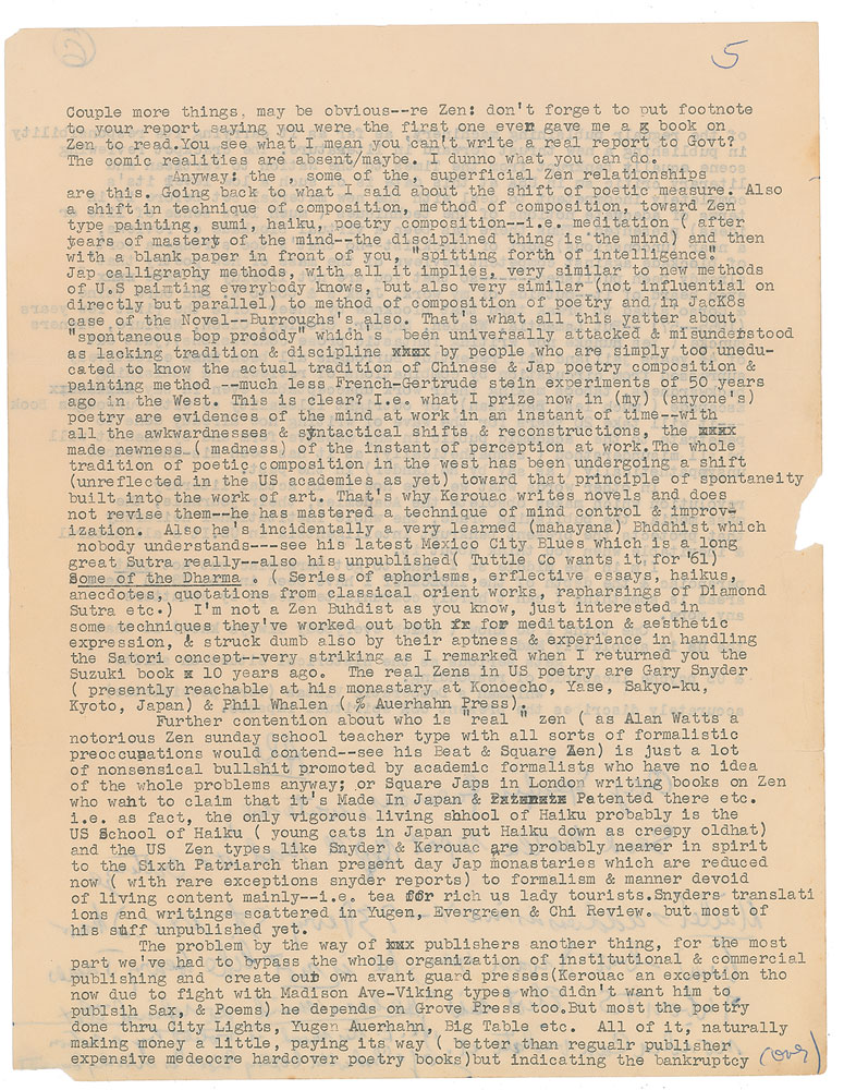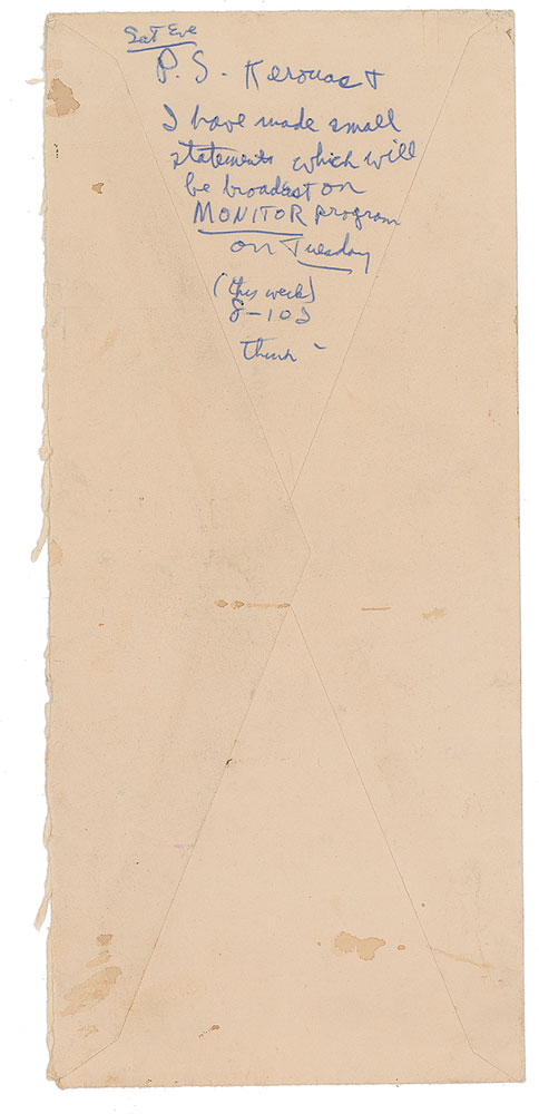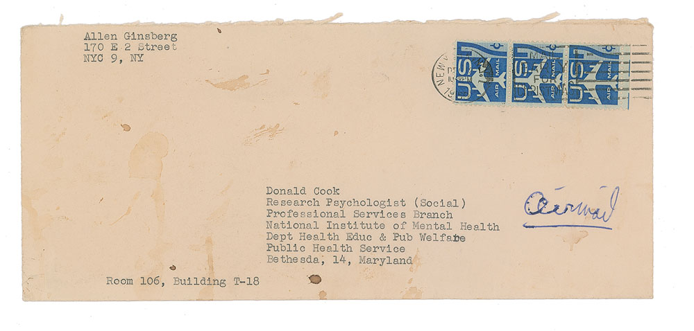 Ginsberg continues: "Zen: don't forget to put footnote to your report saying you were the first one ever gave me a book on Zen to read…I'm not Zen Buddhist as you know, just interested in some techniques they've worked out both for meditation & aesthetic expression." He goes on to discuss Zen and publishing, before concluding: "One thing I do know (which everybody always knew) is that the US is absolutely Mad. gets serious as the historical situation shifts & US psyche incapable of responding. Whitman's Democratic Vistas (very pessimistic) accurately describes the present USA spiritual impasse." He adds a handwritten postscript, "Any specific questions, write me; send me the report and I'll read it & criticize. Mailer's address is in NY—73 Perry St NYC. I know him—but I warn you, he is not like Henry James of whom T.S. Eliot said 'He has a mind so refined that no idea can violate it.' i.e. his mind is molded by a notion of a 'God with boxing gloves' as Orlovsky commented." In very good to fine condition, with light creasing and staining, and small areas of paper loss along the edges. Accompanied by the original mailing envelope, with a handwritten note on the reverse: "P.S. Kerouac & I have made small statements which will be broadcast on Monitor program on Tuesday."