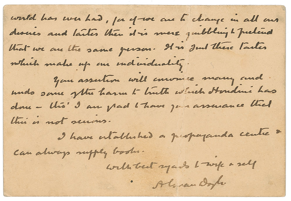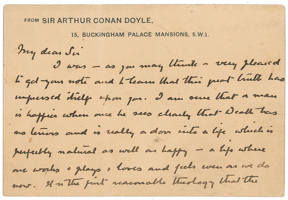 ALS signed “A. Conan Doyle,” one page both sides, 5 x 3.5, personal letterhead, no date. Letter to a gentleman concerning his spiritualist beliefs, in part: "I was—as you may think—very pleased to get your note and to learn that this great truth has impressed itself upon you. I am sure that a man is happier when once he sees clearly that Death has no terrors and is really a door into a life which is perfectly natural as well as happy—a life where one works & plays & loves and feels even as we do now. It is the first reasonable theology that the world has ever had, for if we are to change in all our desires and tastes then it is mere quibbling to pretend that we are the same person. It is just these tastes which make up an individuality. Your assertion will convince many and undo some of the harm to truth which Houdini has done—tho' I am glad to have your assurance that this is not serious. I have established a propaganda centre & can always supply books." In very good to fine condition, with a vertical crease which passes through the signature.