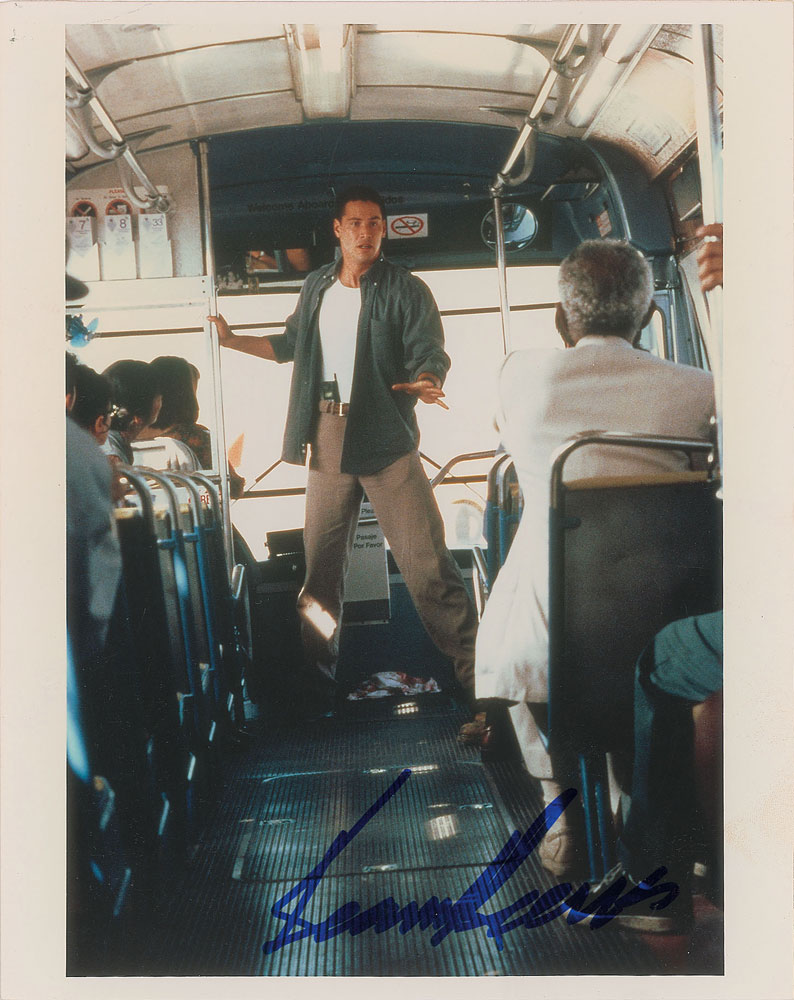 Color glossy 8 x 10 full-length photo of Keanu Reeves as heroic cop Jack Traven from the 1994 action flick Speed, signed in blue felt tip. In fine condition. From The John Brennan In-person Autograph Collection.