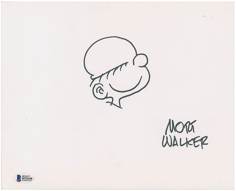 Original felt tip sketch of Private Beetle Bailey on a white 10.75 x 9 sheet, signed below by Mort Walker. In fine condition, with a Beckett Authenticity label affixed to lower left corner. From The John Brennan In-person Autograph Collection. Learn more about our Animation Expert, Harry Kleiman.