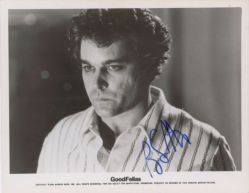 Glossy 10.25 x 8 Warner Bros. publicity photo of Liotta as Henry Hill from the Oscar-nominated 1990 crime film Goodfellas, signed in blue felt tip. In fine condition. From The John Brennan In-person Autograph Collection.