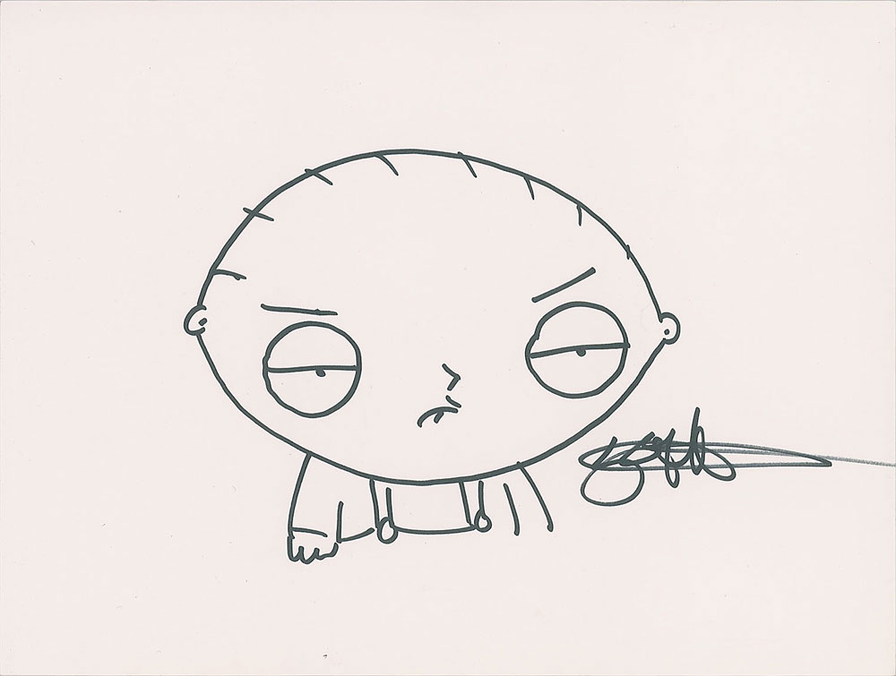 Original felt tip sketch of an entirely unimpressed Stewie Griffin from the animated television series Family Guy on a white 12 x 9 sheet, signed by Seth MacFarlane. In very fine condition. From The John Brennan In-person Autograph Collection. Learn more about our Animation Expert, Harry Kleiman.