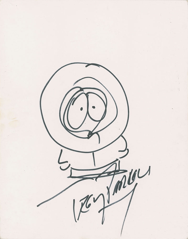 Original signed felt tip sketch of Kenny McCormick from the animated television series South Park on a white 11 x 14 sheet, signed below by Trey Parker. In fine condition. From The John Brennan In-person Autograph Collection. Learn more about our Animation Expert, Harry Kleiman.