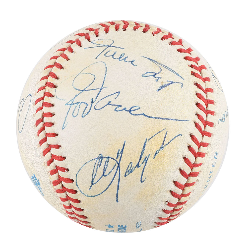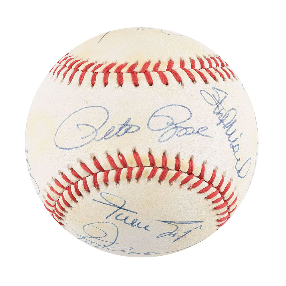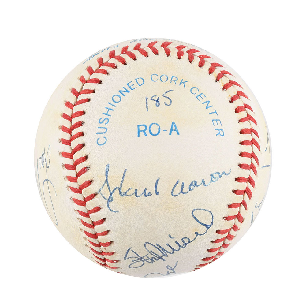 Official Rawlings American League (Brown) baseball signed in ballpoint by eight members of the 3000 Hit Club: Pete Rose (ss), Hank Aaron, Willie Mays, Stan Musial, Lou Brock, Al Kaline, Rod Carew, and Carl Yastrzemski. In fine condition, with areas of light toning. Accompanied by a full letter of authenticity from JSA.