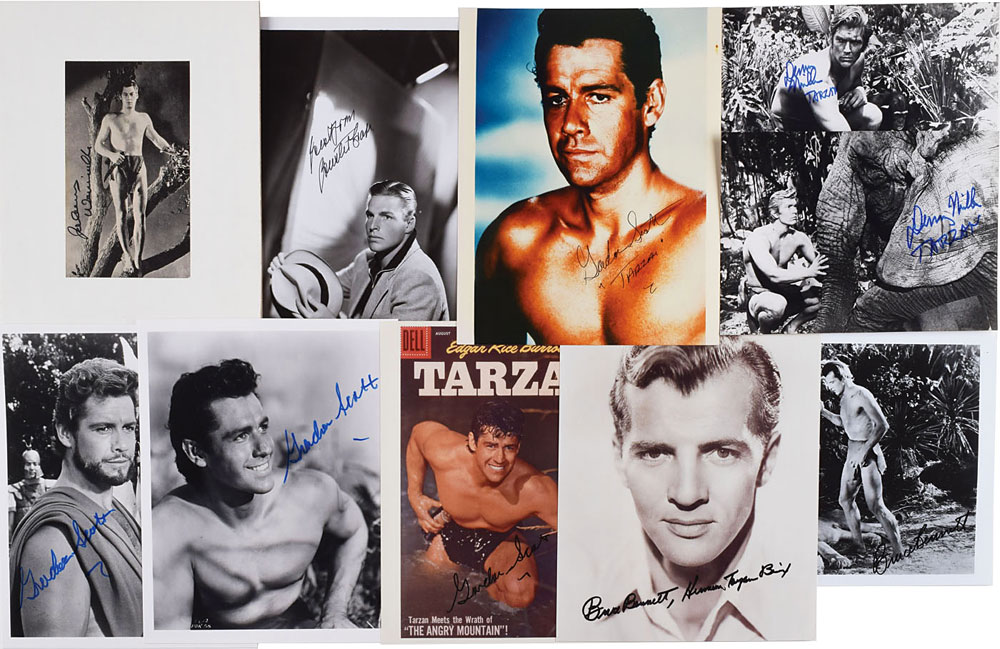 Group of ten photos of various types, ranging in size from 3.75 x 6.25 to 8 x 10, each signed in felt tip by an actor from the Tarzan film series, including: Johnny Weissmuller (small paperstock photo affixed to a larger mount), Buster Crabbe, Denny Miller (2), Gordon Scott (4), and Bruce Bennett (2). In overall fine condition.