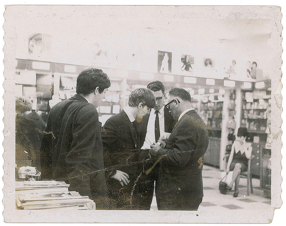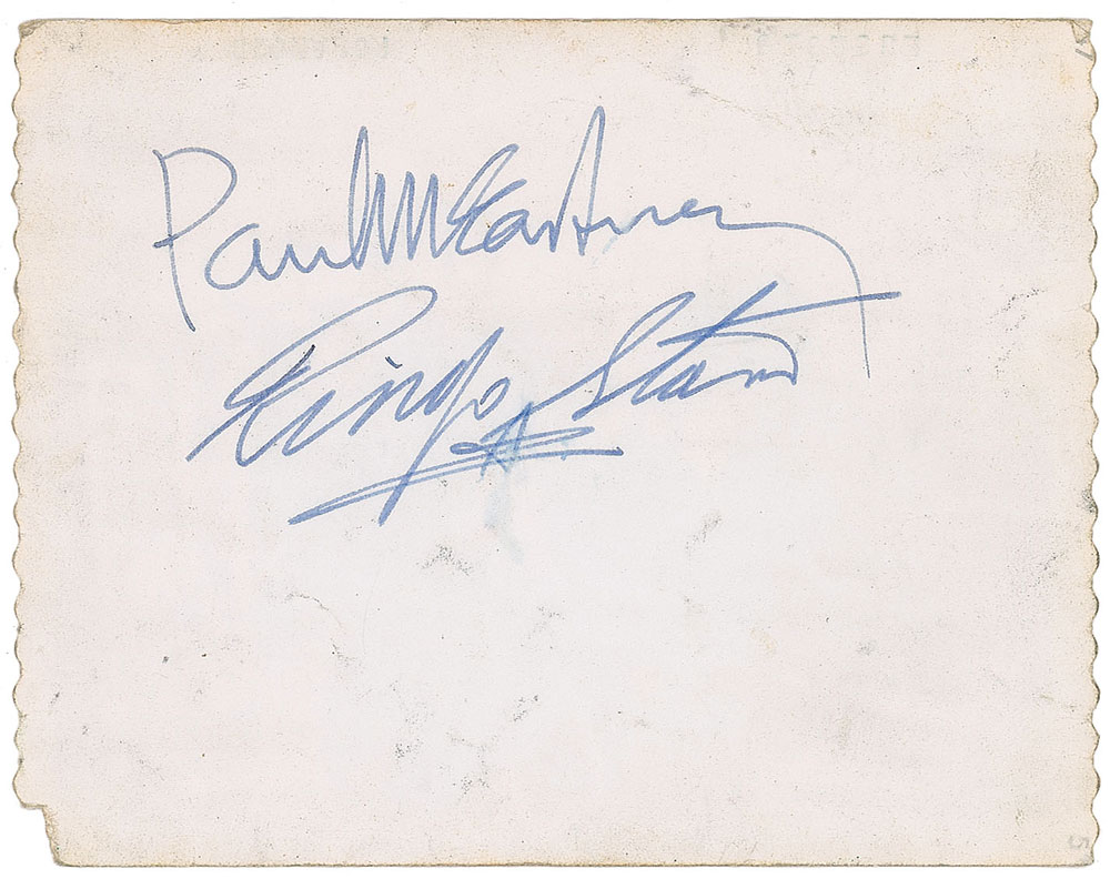 Vintage glossy 4.25 x 3.25 candid deckle-edge photo of Ringo Starr and Paul McCartney speaking with employees in a London camera shop in 1963, signed on the reverse in black ink by the pictured Beatles. In very good condition, with light soling and overall creasing. Accompanied by a typed letter of provenance from the prior owner: “The photo was taken in about 1962/63 in a camera shop in London by the name of ‘Westminster Cameras.’ By a friend of my wife and I who worked there called Ray Ingram, he lived in Bexleyheath Kent.”