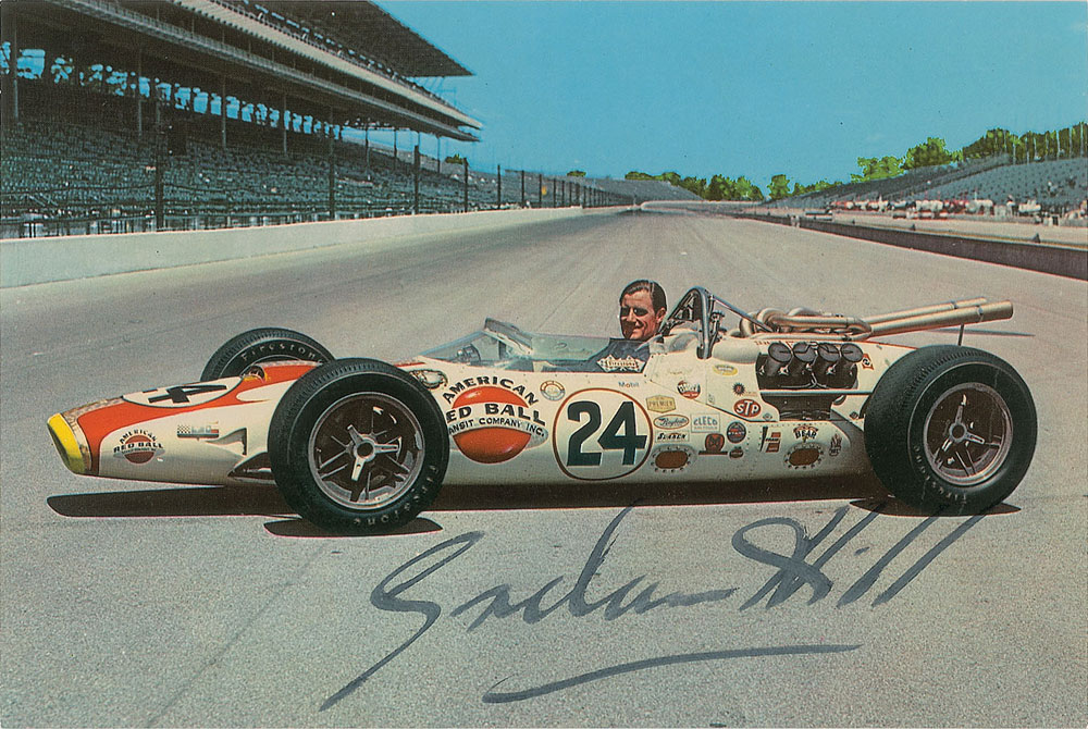 British racing driver (1929-1975) who was twice the Formula One World Champion. He is the only driver ever to win the Triple Crown of Motorsport—the 24 Hours of Le Mans, Indianapolis 500, and the Monaco Grand Prix. Color glossy 9 x 6 jumbo postcard photo of Hill seated in his Lola-Ford T90 'Red Ball Special' race car, the same vehicle he used to win the 1966 Indianapolis 500 as a rookie, signed prominently in black felt tip. In fine condition, with some light edge creasing.
