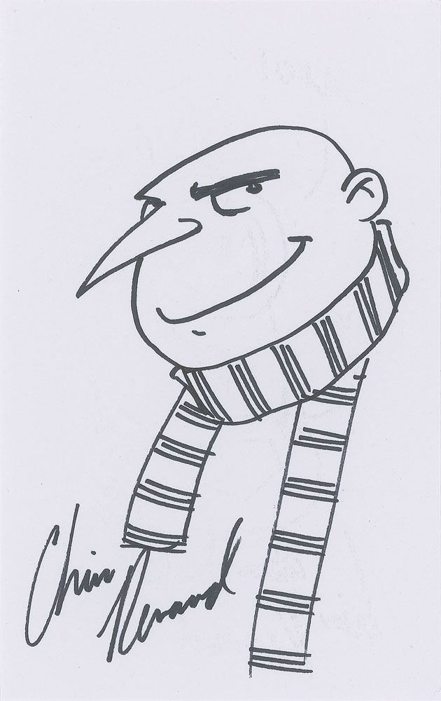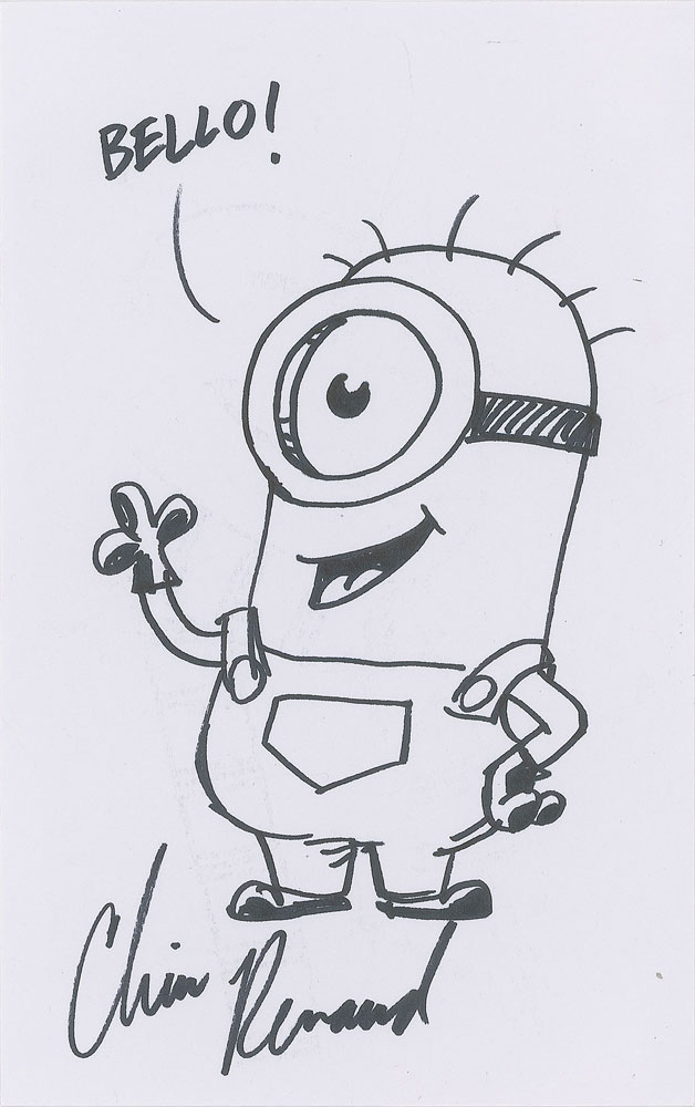 Terrific trio of original felt tip sketches by Chris Renaud on individual white 5 x 8 sheets, each signed by Renaud and depicting a character from the popular Despicable Me series: including: Gru the super villain with his striped scarf; a kingly Minion, with robe, crown, and scepter, holding a teddy bear; and a one-eyed Minion waving and yelling: “Bello!" In overall very fine condition. Learn more about our Animation Expert, Harry Kleiman.