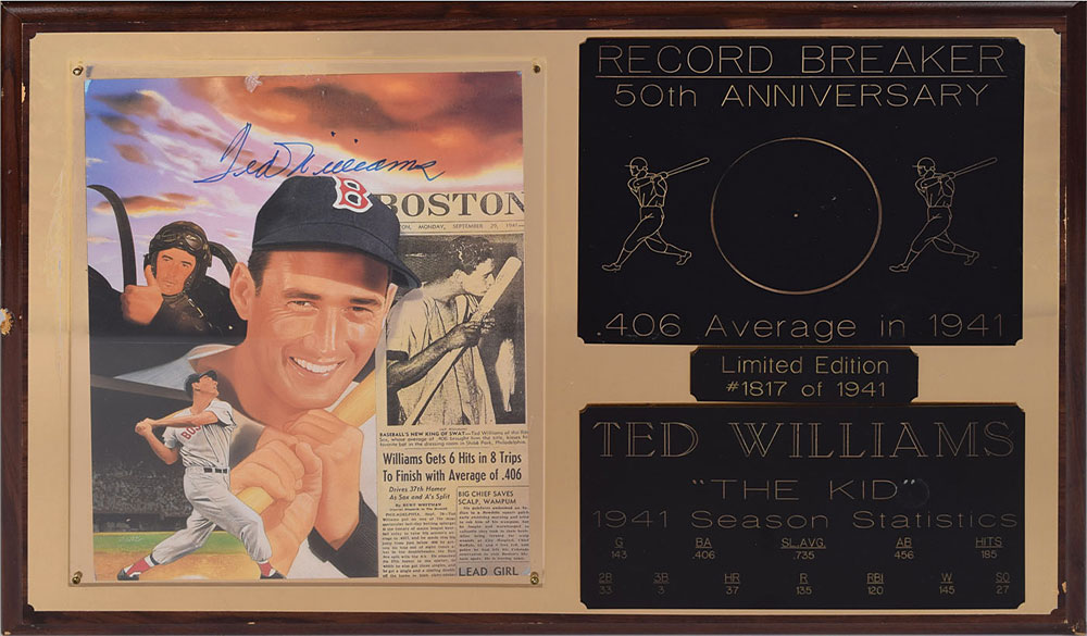 Color semi-glossy 8 x 10 photo of an artistic collage honoring the life of Ted Williams, signed in blue felt tip. The photo is displayed within a limited edition plaque, 20 x 13, numbered 1817/1941, with engraved plates featuring stats from his record-breaking 1941 season. The photo itself is in fine condition, however the Plexiglas is scratched and the plaque scratched and gouged.