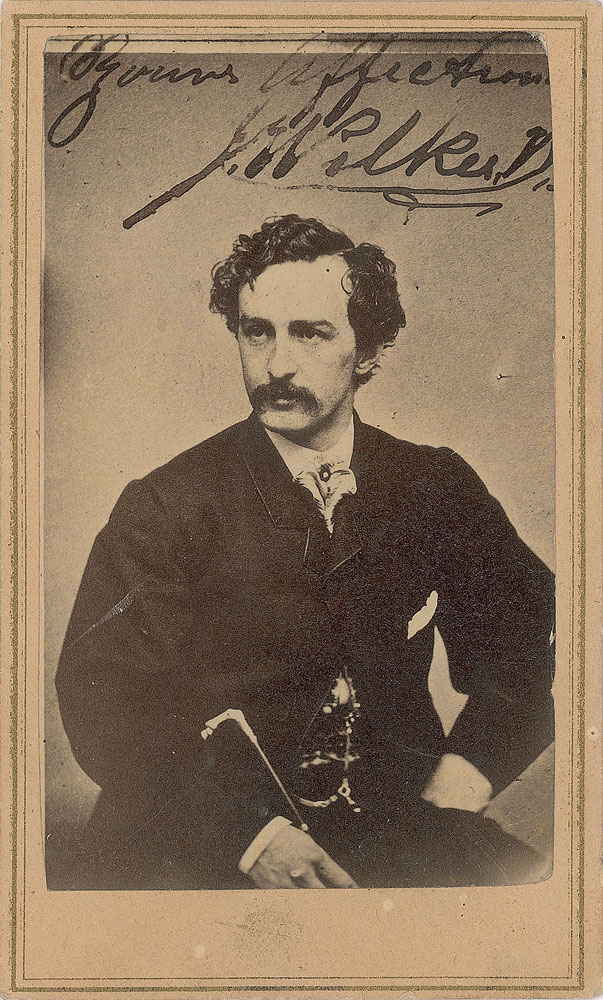 Uncommon 2.5 x 4 carte-de-visite portrait of John Wilkes Booth in a half-length seated pose with facsimile signature inherent to the photograph. Reverse bears a Weiss Gallery stamp dated April 24, 1865. In fine condition.