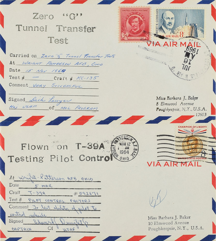 Two flown covers carried on flights by USAF astronauts who never went to space, both with cachets filled out with information on the flights, signed by the respective pilots: one flown on a T-39A at Wright Patterson AFB on March 5, 1964 by Edward J. Dwight, Jr., during a flight "to test ability of pilot to control vehicle"; and one carried on a KC-135 at Wright Patterson AFB on November 15, 1968 by Dick Lawyer, for a "Zero 'G' Tunnel Transfer Test." In overall fine condition.