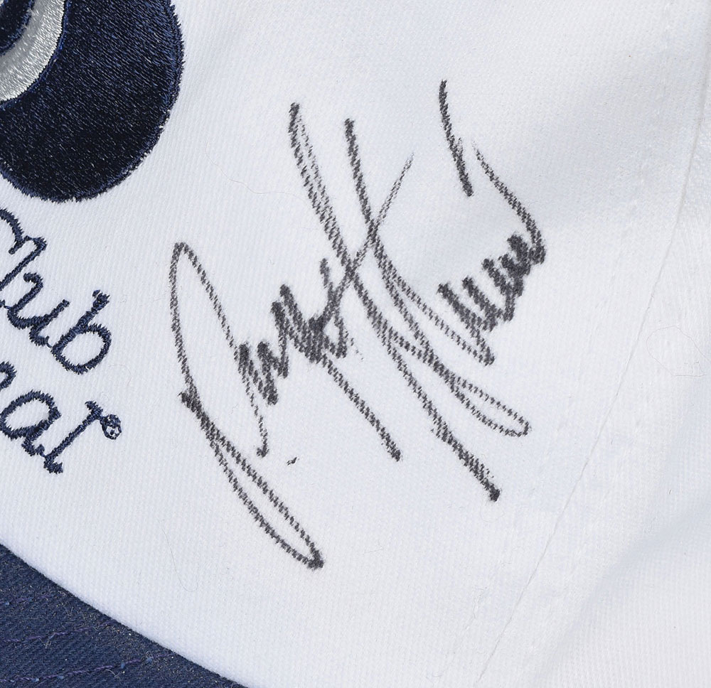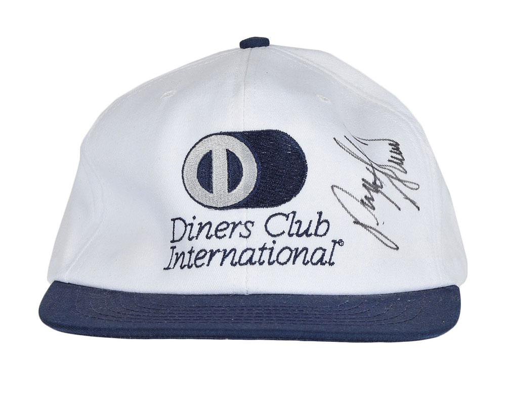 White "Diners Club International" baseball cap with an adjustable strap, signed near the logo in black felt tip by Payne Stewart. In fine condition.