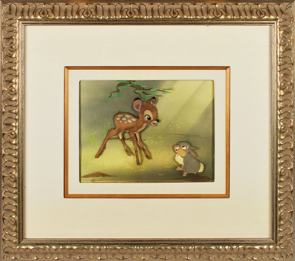 (Walt Disney Studios, 1942) Wonderful original production cels of Bambi and Thumper from Bambi, depicting the fawn and bunny interacting in attractive full-length poses. The cels have been trimmed and applied to a hand-painted background as prepared by Courvoisier Galleries for sale. Images measure 4.5 x 4.5 (Bambi) and 2 x 2.25 (Thumper), with a mat opening of 9.25 x 7. Archivally cloth-matted and framed to an overall size of 20.5 x 18.25. The piece has the original Disney Courvoisier Galleries label on the reverse. In fine condition, with some rippling to the images. Learn more about our Animation Expert, Harry Kleiman.