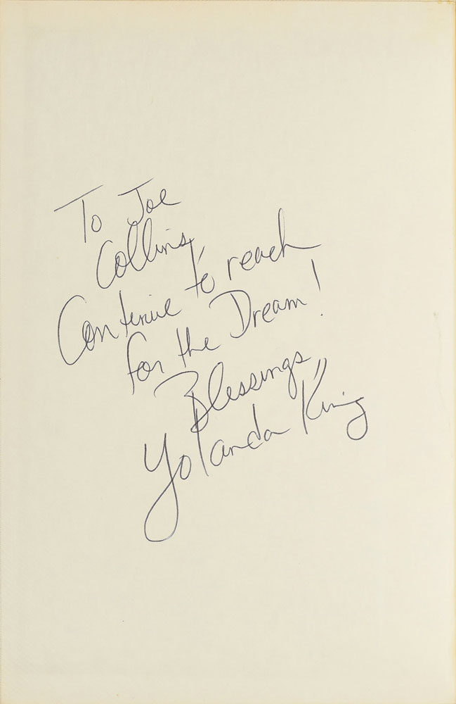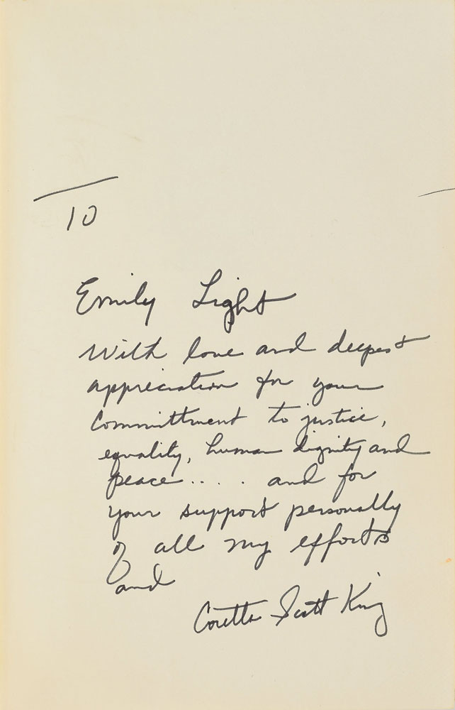 Signed book: My Life with Martin Luther King, Jr. First edition. NY: Holt, Rinehart and Winston, 1969. Hardcover with dust jacket, 6.5 x 9.25, 372 pages. Lengthily signed and inscribed on the first free end page in black felt tip, "To Emily Light, With love and deepest appreciation for your commitment to justice, equality, human dignity and peace….and for your support personally of all my efforts, Coretta Scott King." Also signed and inscribed on the front pastedown in black ballpoint by their daughter, "To Joe Collins, Continue to reach for the Dream! Blessings, Yolanda King." In fine condition.