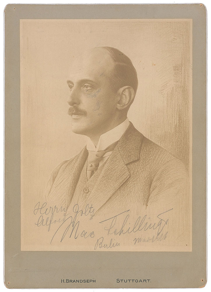 German conductor, composer, and theatre director (1868-1933). Handsome 6.25 x 8.75 cabinet photo of an illustrated portrait of Schillings, signed and inscribed at the bottom of the image in pencil, and dated Berlin, March 1916. Published by H. Brandseph of Stuttgart. In fine condition, with some surface scuffing to the facial area and tiny tack holes to corners.